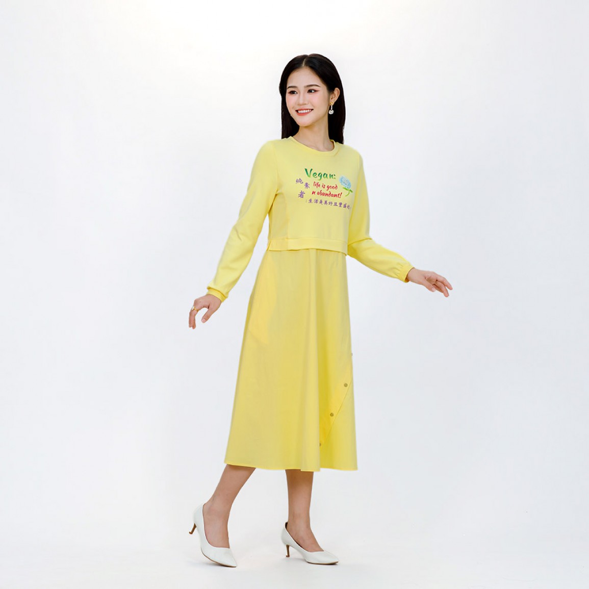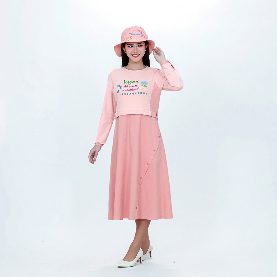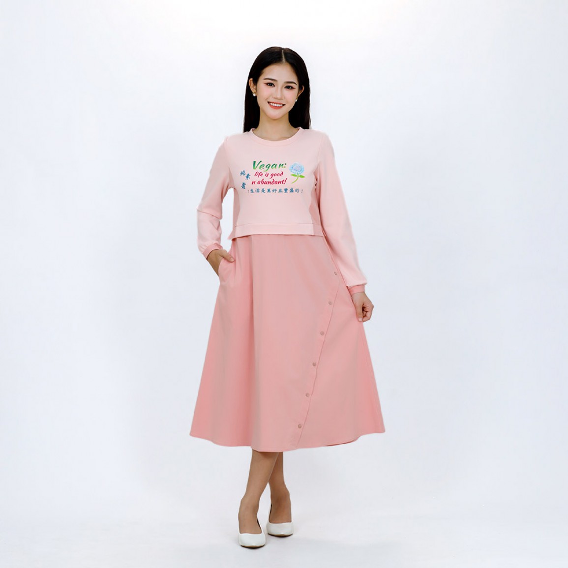 英文名稱: Vegan Slogan "What a Smart Choice!" Faux Two-Piece Long-Sleeved Dress