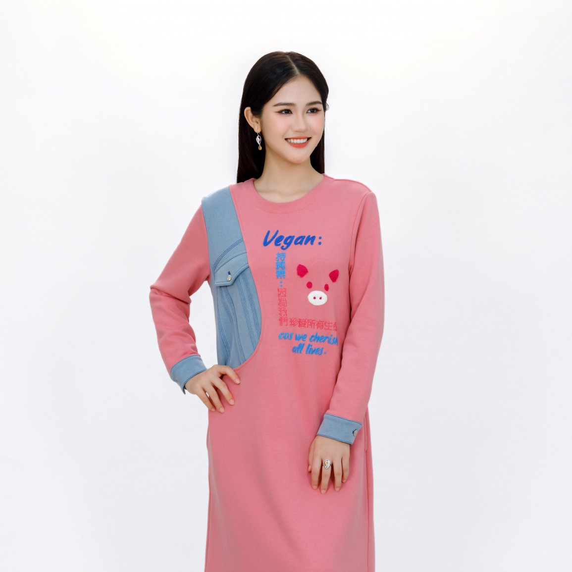 Vegan Slogan Animal Friends Denim Pocket Warm Cotton Dress B1552【Celestial Cloud】